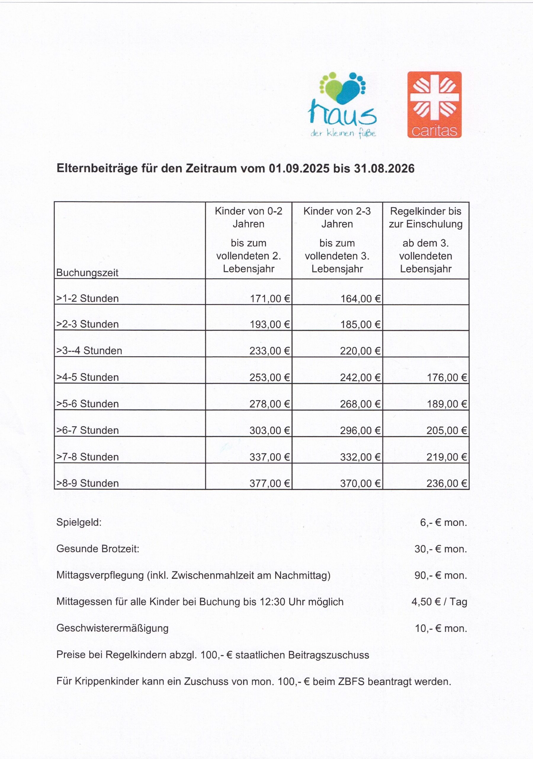 Die Preisstaffelung zu den individuellen Betreuungswünschen entnehmen Sie bitte aus den Elternbeiträgen. Für das „gesunde Frühstück“ wird ein Monatsbeitrag von 30 Euro erhoben, für das Mittagessen eine Pauschale von 90,00 Euro im Monat.